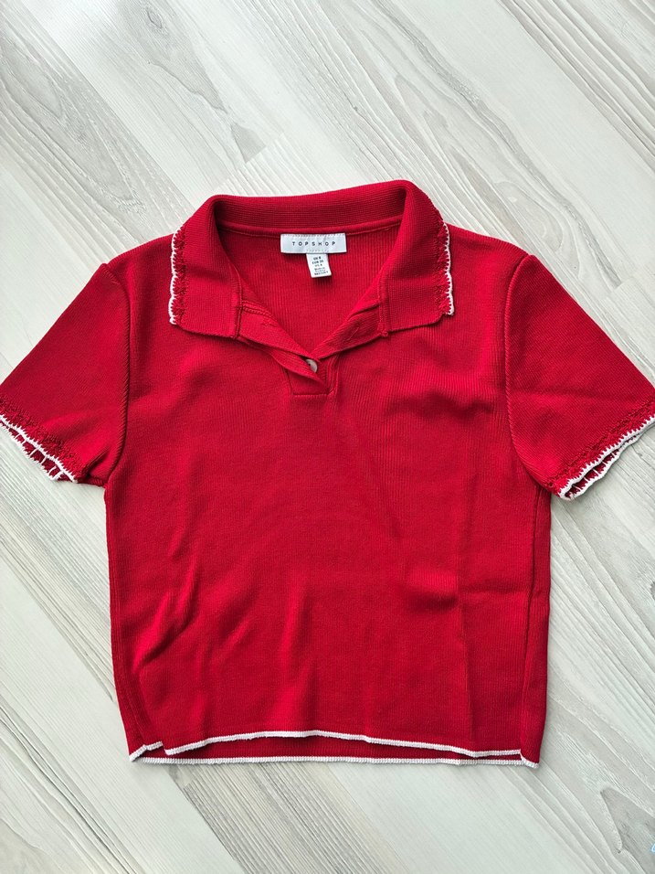 Pamuklu , düğmeli, yakalı ve kısa kollu kırmızı polo tişört. Salaş kesimi ve beyaz detaylarıyla sokak tarzına uygun.