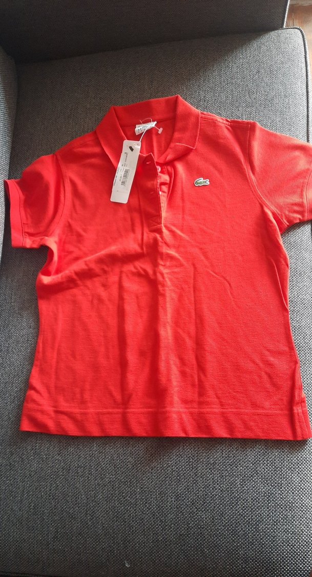 Nar çiçeği kırmızı, düğmeli polo yaka tişört. %100 coton, kısa kollu, hiç giyilmemiş, etiketi üzerinde, dar kalıp 40 beden şık bir sokak stili için uygundur.