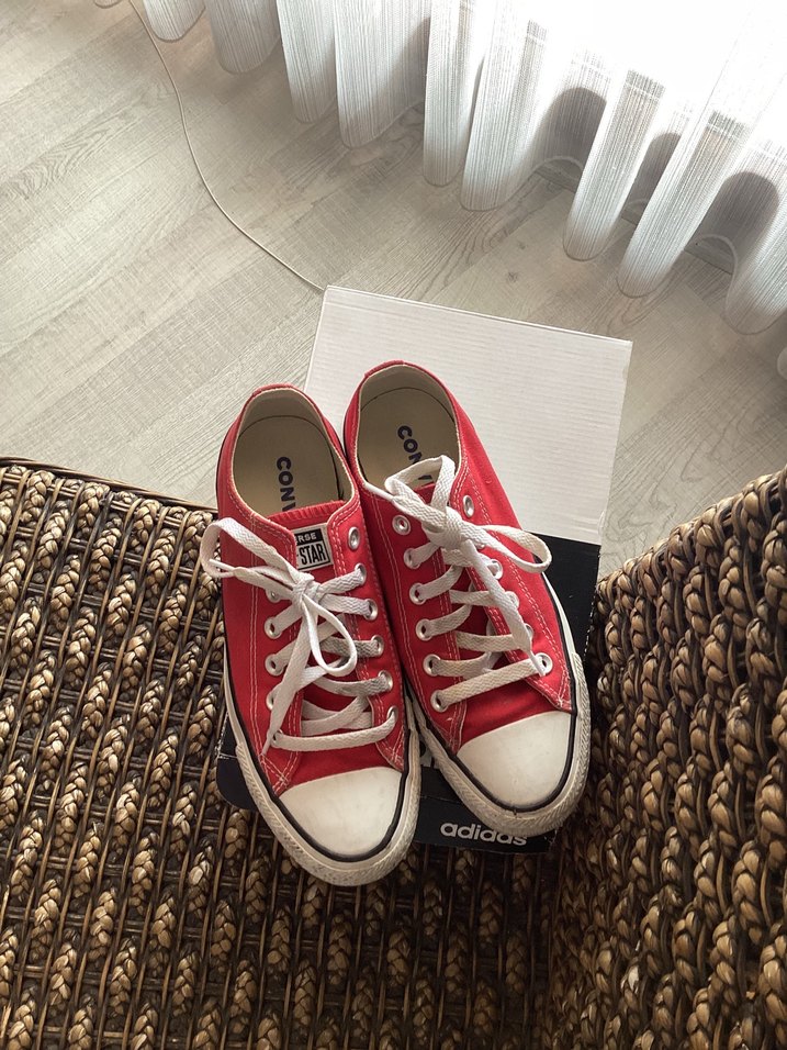 Beyaz bağcıklı ve burun kısmı kaplamalı, düz tabanlı kırmızı kadın spor ayakkabı. Rahat ve şık, günlük kullanıma uygun athleisure tarzında.