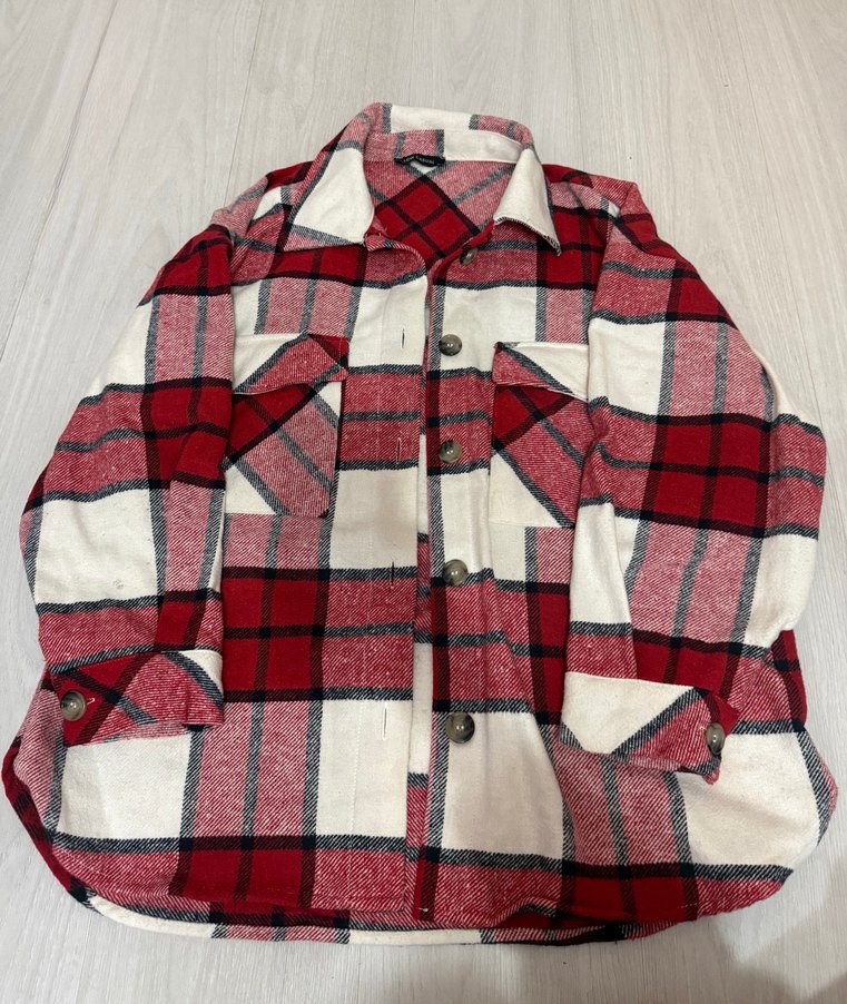 Kadınlar için açık kırmızı ekose desenli, düğmeli ve yakalı gömlek. Uzun kollu, bol kesim ve yumuşak sentetik kumaştan yapılmıştır. Az kullanıldı defosu yoktur.