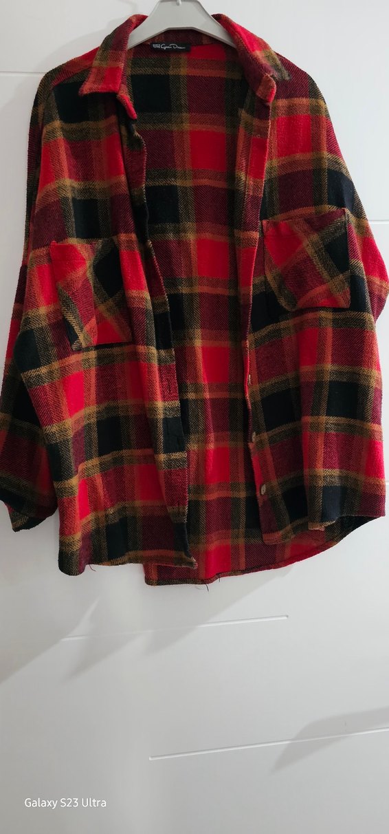 Kadınlar için düğmeli, uzun kollu, normal boyda, kırmızı ekose desenli, rahat kesim tekstil gömlek. Günlük kullanıma uygundur.