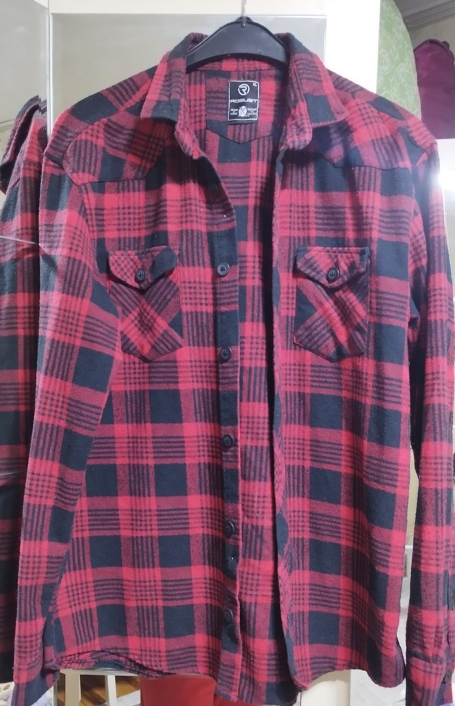 Kadın gömlek, düğmeli ön, uzun kollu ve bol kesimdir. Koyu kırmızı-siyah ekose desene ve çentikli yaka sahiptir, sentetik kumaştan yapılmıştır.
