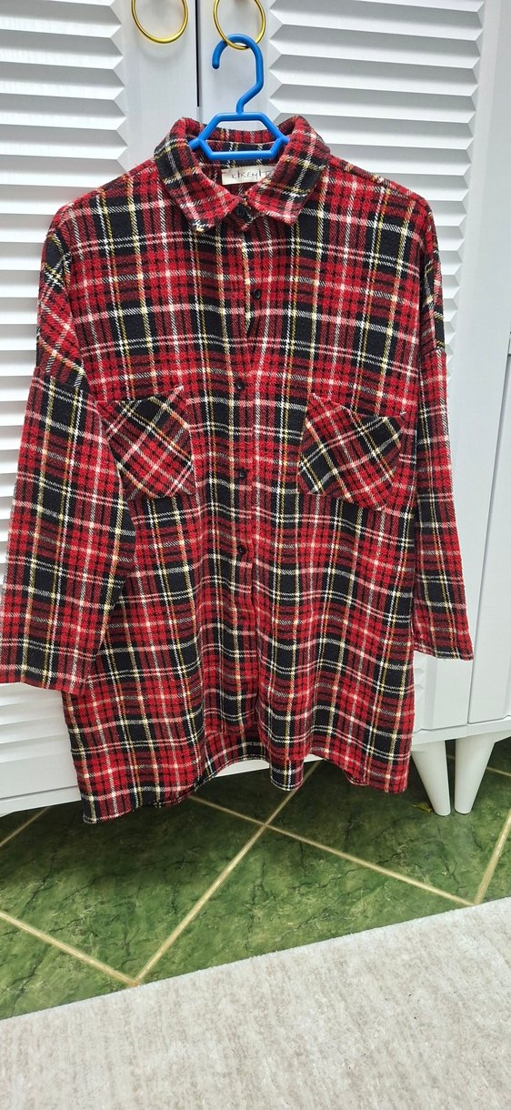 Kadınlar için düğmeli, uzun kollu ve rahat kesim gömlek. Renkli kırmızı ekose desenli, yumuşak kumaştan, günlük kullanıma uygun. Göründüğü gibidir