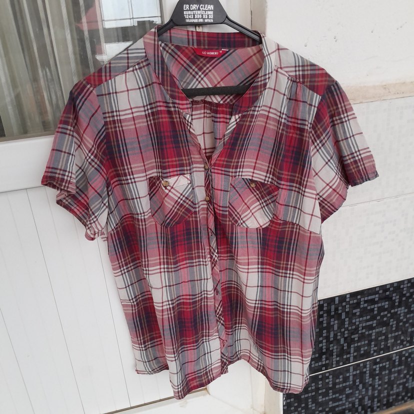 Kadınlar için rahat kesim, kısa kollu, düğmeli önü ve yakalı kırmızı gri ekose desenli gömlek. Günlük sokak stiline uygun yumuşak dokulu kumaş.