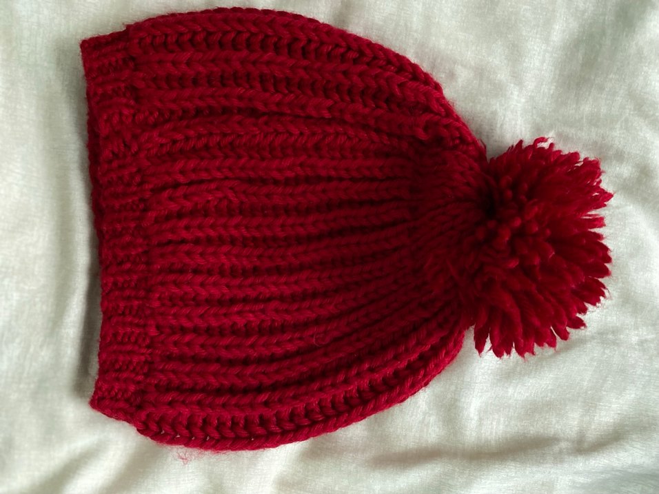 Kadınlar için kırmızı örgü iplikten yapılmış, rahat ve renkli bir bere.