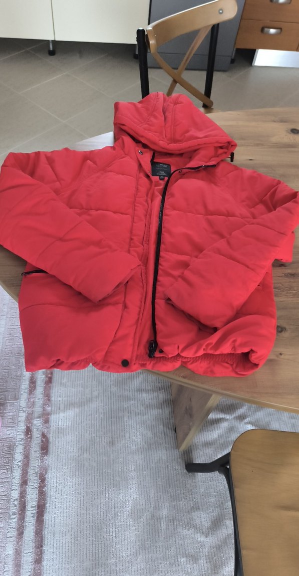 Kadınlar için parlak kırmızı, fermuarlı ve uzun kollu, rahat polar kumaştan yapılmış, midi boy ve vücuda oturan kışlık kaban. Dış mekan sokak stili için uygundur.