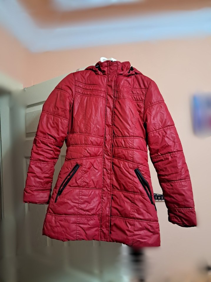 Kırmızı, fermuarlı ve uzun kollu, vücuda oturan bu mont, sentetik yumuşak kumaştan üretilmiştir. Hafif birkaç küçük siyah leke vardır, ceplerindeki sökülme dikilmiştir. Görünüşü yeni ayarındadır.