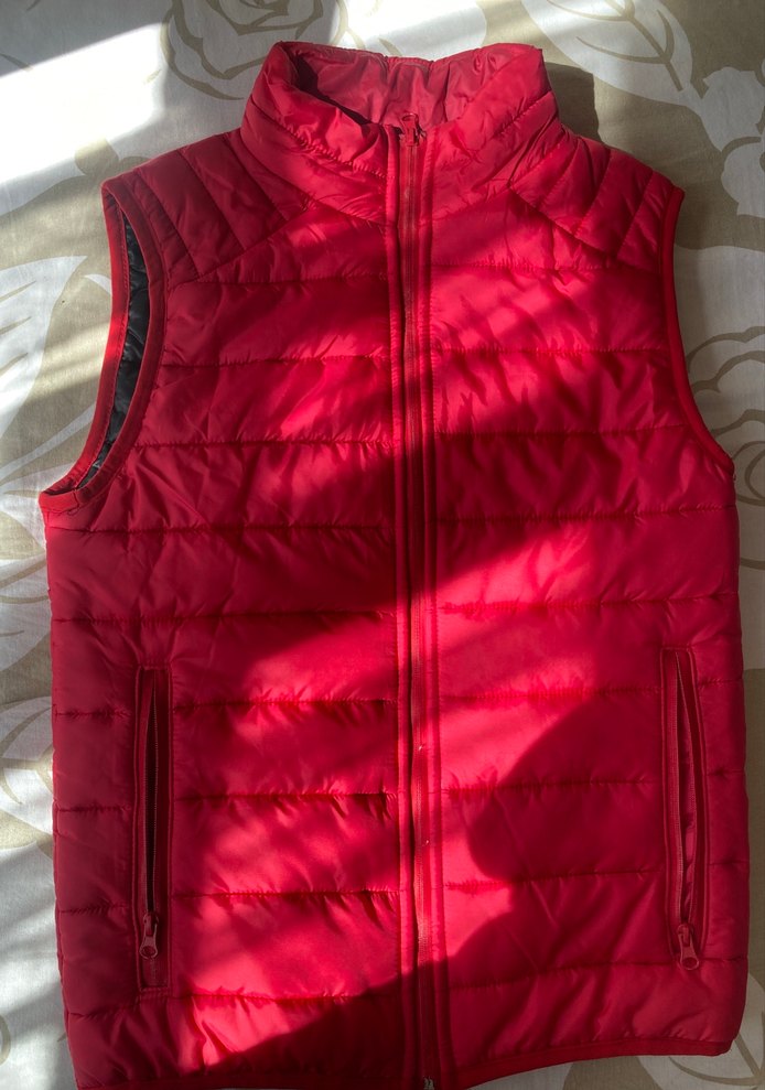 Kolsuz kırmızı şişme yelek, yüksek yakalı ve fermuarlı ceplidir. Vücuda oturan kesimi ve normal boyu ile yumuşak ve sıcak kumaştandır. ✨