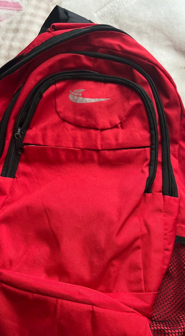 Kadınlar için parlak kırmızı sentetik kumaştan fermuarlı spor sırt çantası. Athleisure ve street wear tarzına uygun, sade ve temel bir görünüme sahiptir.
