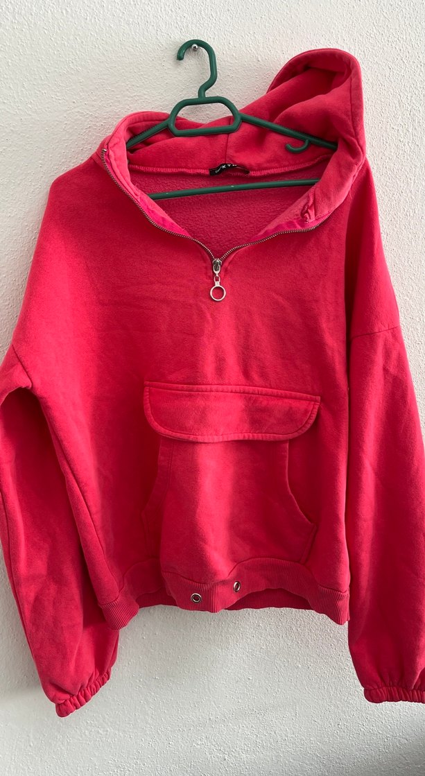 Kadınlar için parlak kırmızı renkte, fermuarlı ve yuvarlak yakalı sweatshirt. Bol kesim, uzun kollu ve yumuşak, sıcak kumaştan üretilmiştir. Önde cep bulunur, rahat sokak stili için uygundur.