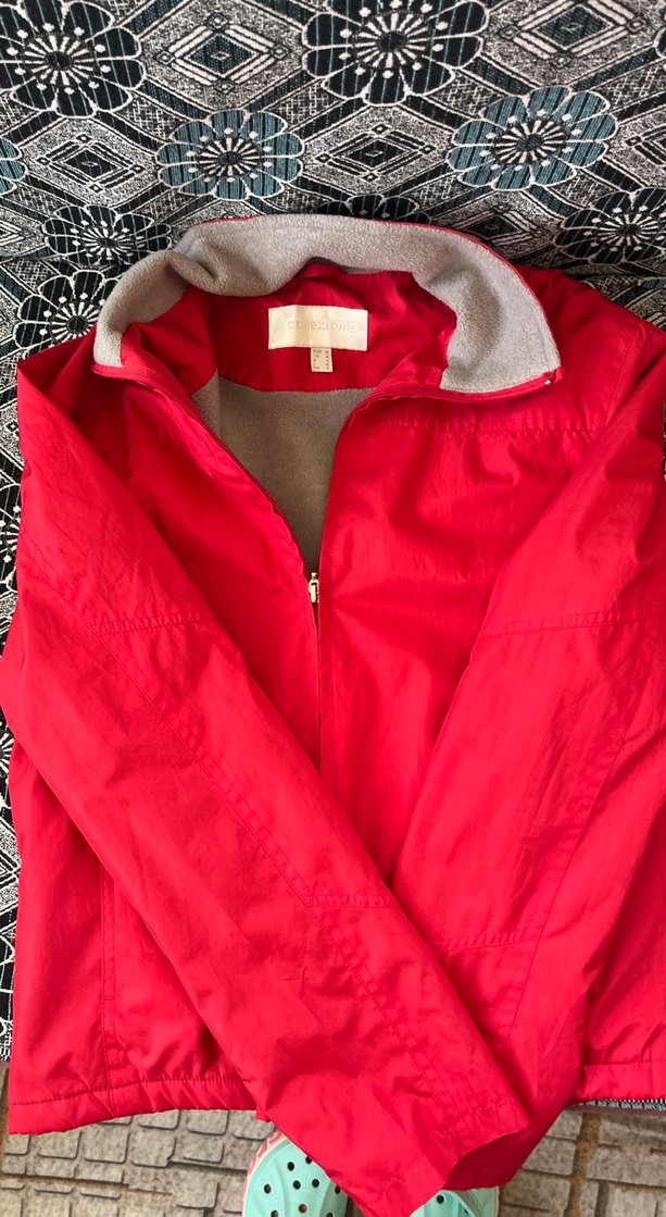 Kadınlar için kırmızı ve gri tonlarda, yüksek yakalı, fermuarlı, dar kesim sentetik kumaştan yapılmış ceket. Sokak stili ve dış mekan kullanımı için uygundur.