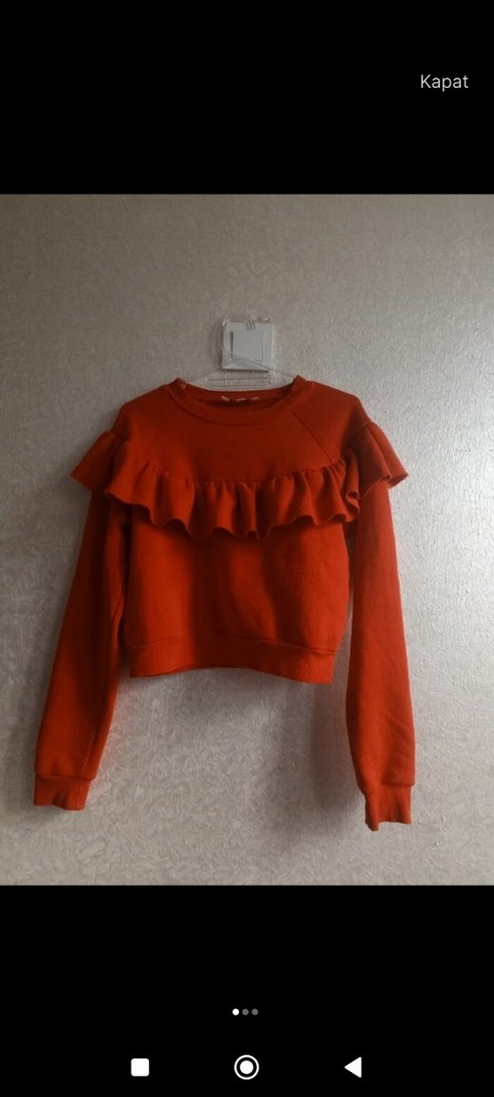 Kırmızı kadın sweatshirt, uzun kollu ve yuvarlak yakalıdır. Göğüs kısmında fırfır detayı bulunur. Yumuşak ve sıcak kumaştan, bol kesimdir.