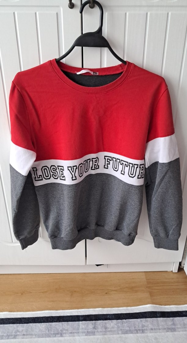 Kadınlar için uzun kollu, bisiklet yaka ve bol kesim sweatshirt. Kırmızı, beyaz ve gri renkler baskılı yazıyla birleşiyor. Yumuşak, örme kumaştan üretilmiştir. Günlük kullanım için uygundur.