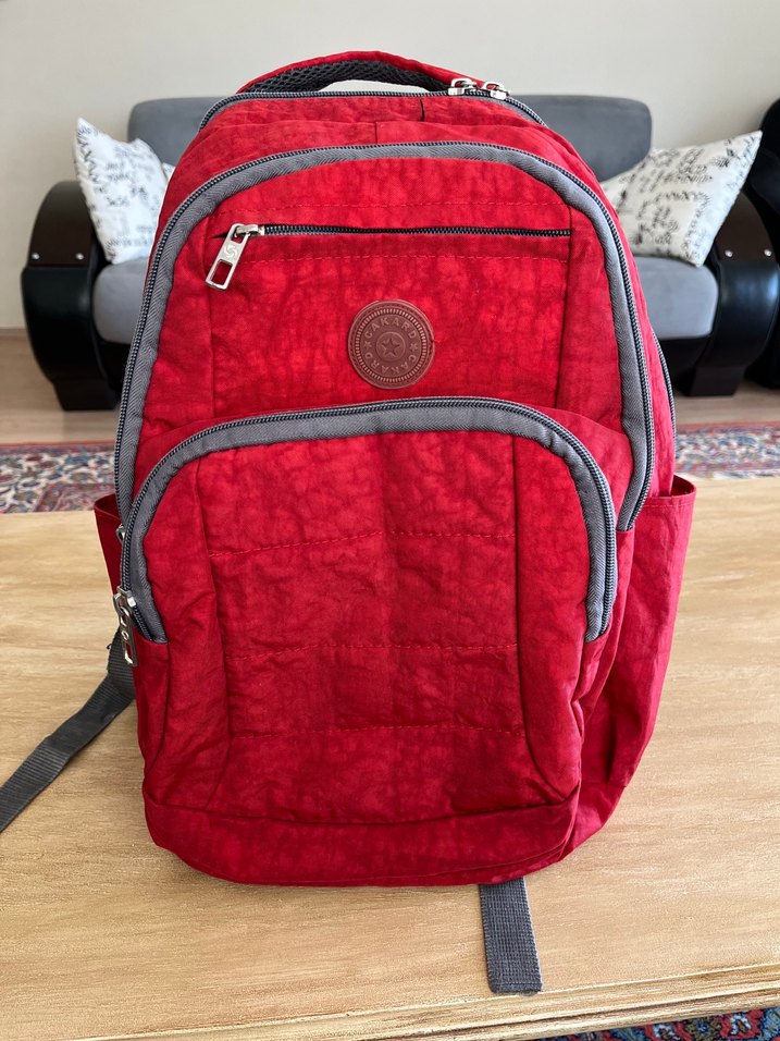 Çocuk için kırmızı ve gri batik desenli, fermuarlı ceplere sahip sentetik kumaş sırt çantası. Günlük kullanıma uygun, trend ve spor tarzıyla uyumlu.