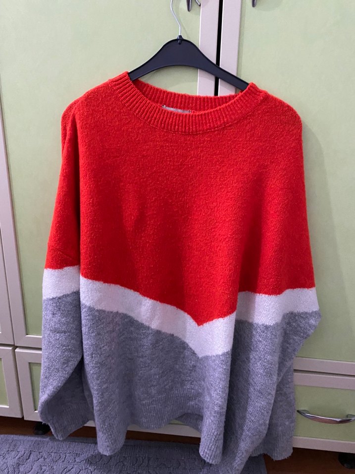 Kadınlar için örme dokulu, yumuşak yün malzemeden üretilmiş, kırmızı ve gri renklerde oversize kesim kazak. Yuvarlak yaka ve uzun kollu, rahat ve gündelik kullanıma uygun.