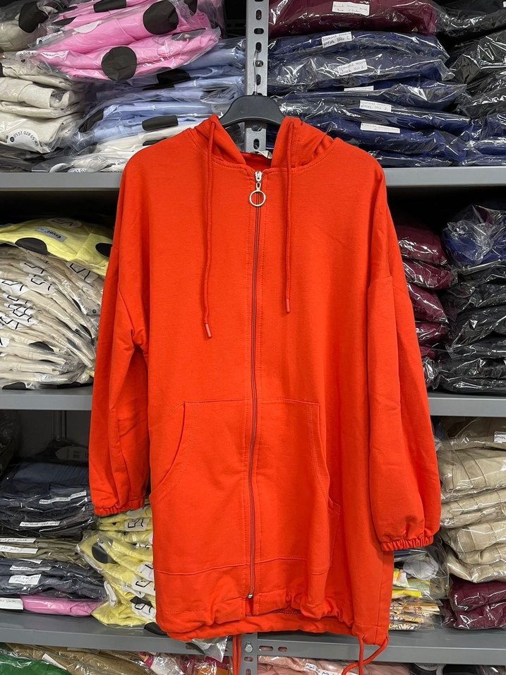 Kadın kırmızı kapüşonlu fermuarlı sweatshirt, uzun kollu ve bol kesimli. Yumuşak ve sıcak kumaştan, uzun boy, rahat sokak stili için uygundur. İki iplik kumaş etiketli tek ebat