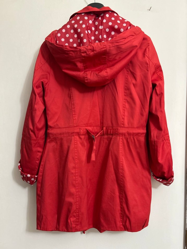 Kırmızı kapüşonlu yağmurluk düğmeli puantiyeli kapüşon astarlı