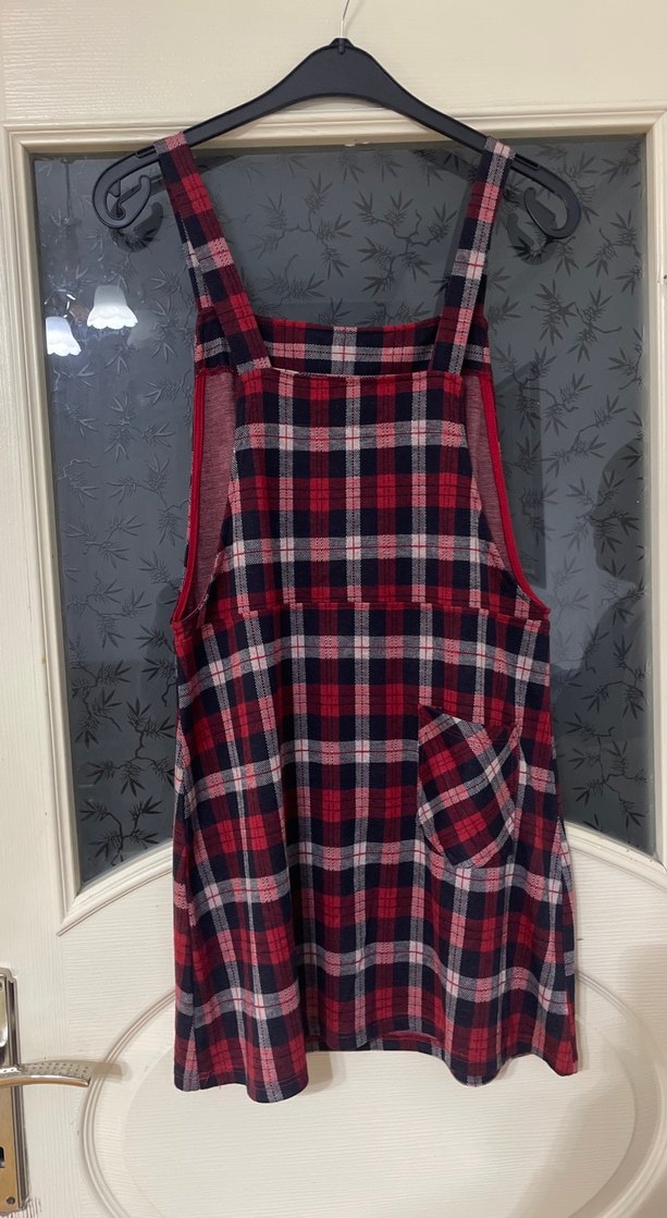 Kadınlar için koyu kırmızı kareli, askılı ve bol kesim mini tulum. Tokalı askıları ve yan cebine sahiptir, günlük kullanım için uygundur.
