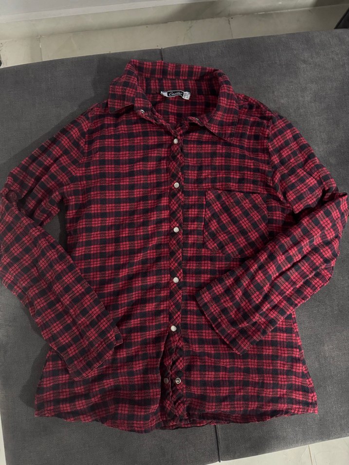 Kadınlar için uzun kollu, düğmeli ve yumuşak tekstil kumaştan üretilmiş gömlek. Salaş kesim, kesik yakalı ve koyu kırmızı kareli desene sahip, günlük rahat stil için uygundur.