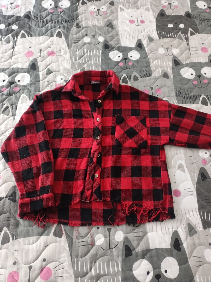 Kırmızı kareli, düğmeli, uzun kollu, yakalı gömlek. Salaş kesim, günlük ve grunge tarzına uygun. Alt kısmı yırtık detaylıdır.