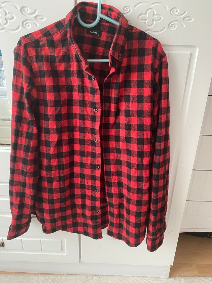 Erkek için düğmeli, uzun kollu, yakalı, pamuklu, kırmızı kareli ve bol kesim gömlek. Günlük kullanım ve sokak stiline uygun.