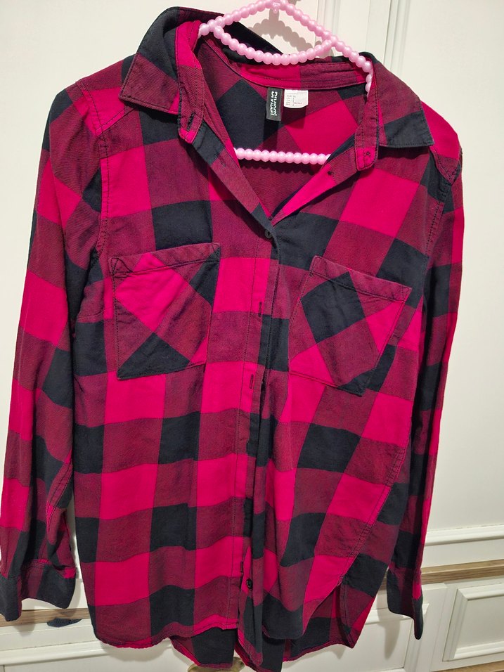 Kadınlar için düğmeli, uzun kollu, normal kesim kırmızı-siyah kareli pamuk gömlek. Notched lapel yakalı, günlük kullanıma uygun grunge punk tarzı.