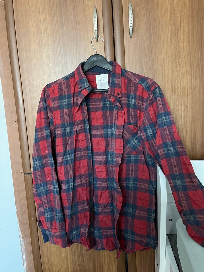 Uzun kollu, düğmeli ve kesik yaka detaylı kadın gömleği. Rahat kalıp ve midi boyda, koyu kırmızı-mavi kareli desenli yumuşak dokulu kumaştan üretilmiştir. Defo yok az giydim