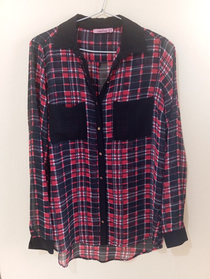 Düğmeli, yakalı ve uzun kollu, kırmızı kareli desenli kadın gömleği. Ürün şifondur içine atletle giymeniz gerekiyor. Ürünün hiçbir sıkıntısı yoktur.
