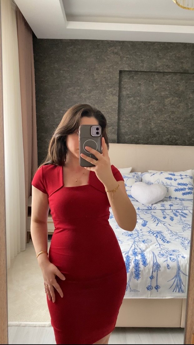Kare yaka ve kısa kollu, dar kesim kırmızı midi kalem elbise. Pürüzsüz sentetik kumaştan, parlak görünümlü, minimal ve şık tarzda, romantik buluşmalar için uygundur. Yakası iki şekilde de kullanılabilir. ♥️