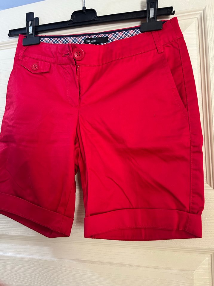 Parlak kırmızı pamuklu kumaştan, kemerli ve mini bermuda şort, rahat dış mekan kullanımı için uygundur , 1-2 kez kullanıldı, defosuz , yeni gibi