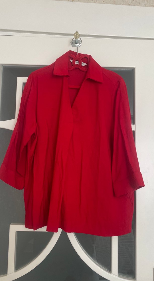 Kadınlar için keten kumaştan, bol kesim, yakalı, düğmeli, parlak kırmızı renkte ve uzun kollu gömlek. Ofis kullanımı için uygundur.