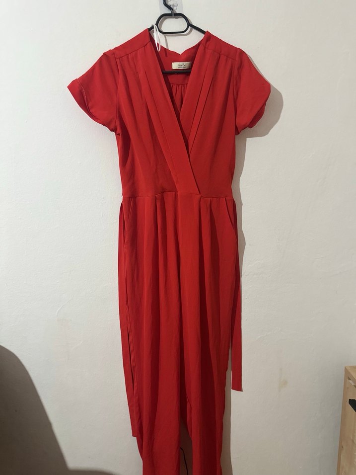 Bu kırmızı renkli kadın tulumu, kısa kollu ve drapeli tasarıma sahiptir. V yaka ve sentetik kumaştan yapılmıştır, romantik akşamlar için uygundur. ❤️