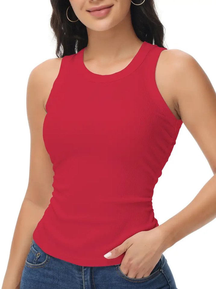 Kadınlar için kırmızı, kolsuz ve dar kesim atlet. Hafif sentetik kumaştan üretilmiş, günlük kullanım ve sokak modasında rahat ve şık bir görünüm sağlar.
