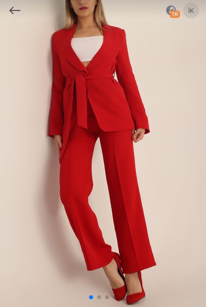 Kadın kırmızı takım, kuşaklı uzun ceket ve askılı kollara sahip. Ofis için modern, düz kesim ve desen içermeyen tasarım.