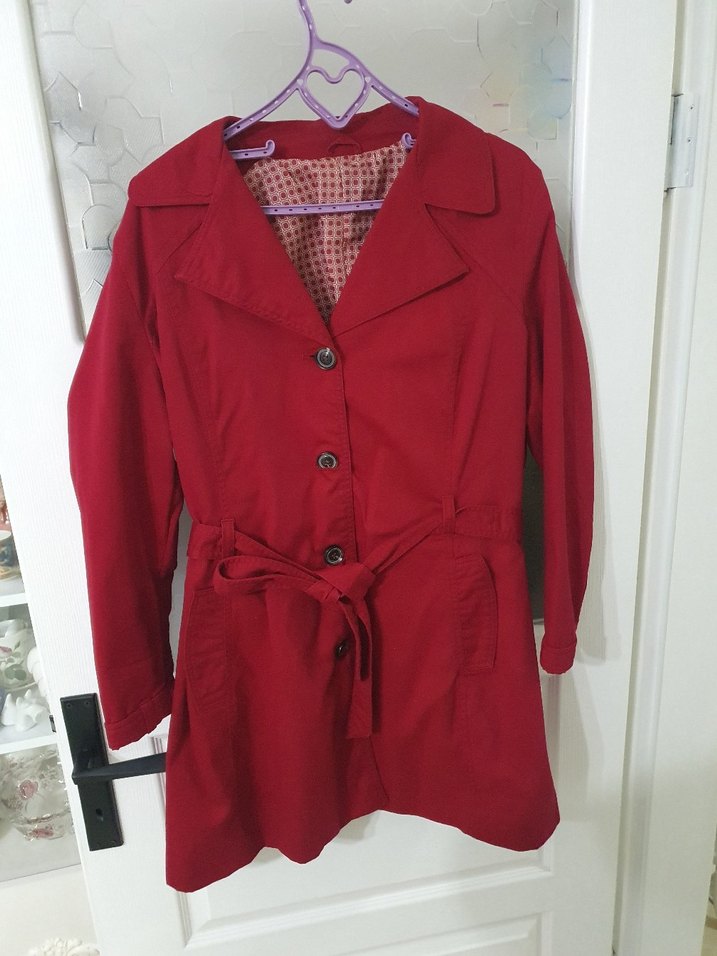 Kadınlar için kırmızı midi uzunlukta, düğmeli, parlak sentetik kumaştan yapılmış trençkot. Uzun kollu, regular fit ve yakası kesimli. Günlük kullanıma uygun.