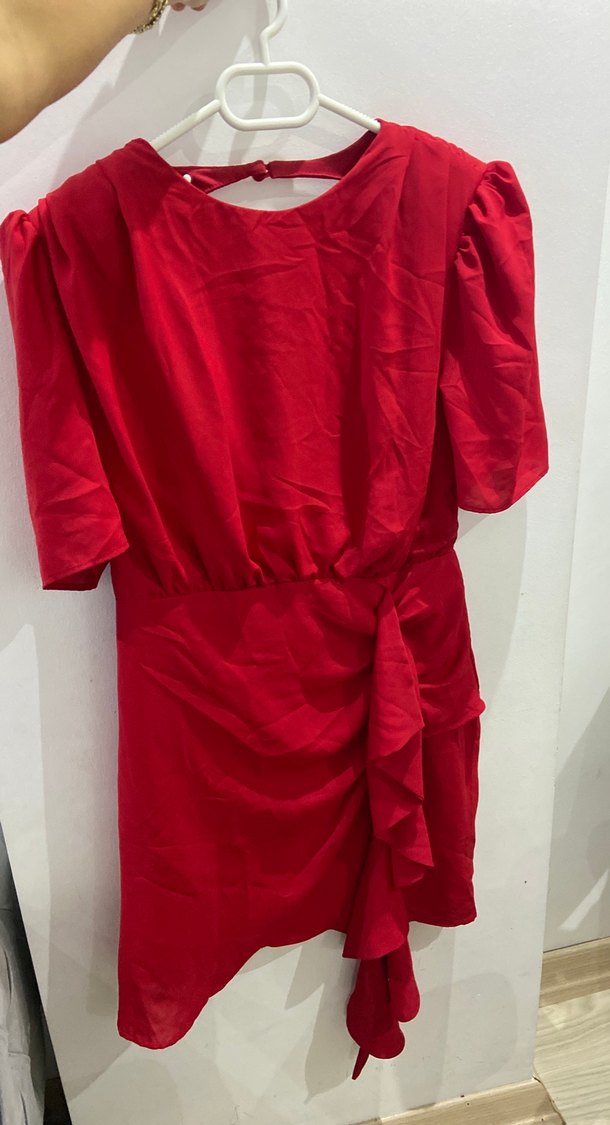 Parlak kırmızı kumaştan, kısa kollu ve midi uzunlukta, vücuda oturan kadın elbisesi. Minimalist ve çağdaş tarzda, desensiz ve belden bağlamalıdır.