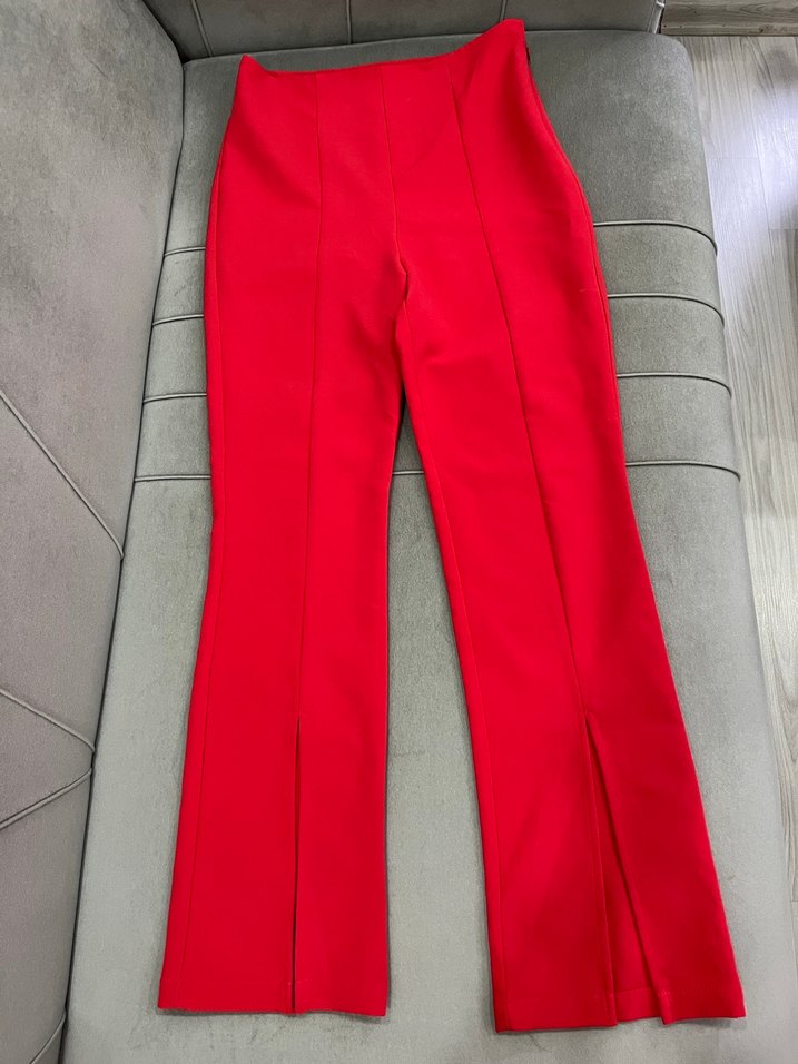 Kırmızı, midi boy, regular kesim kadın pantolon. Yanlarda yırtmaçlı, sentetik kumaştan, ofis için uygun cesur athleisure tarzında.