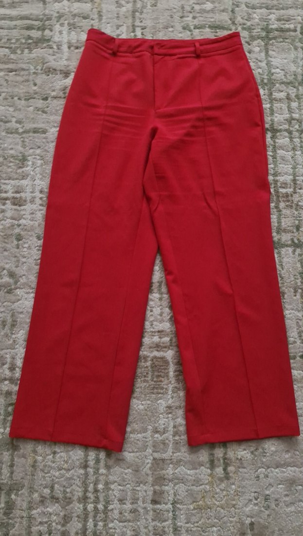 Kadınlar için kırmızı midi kumaş pantolon, regular fit ve parlak sentetik kumaştan, ofis için trend ve zahmetsiz şıklık sunar.