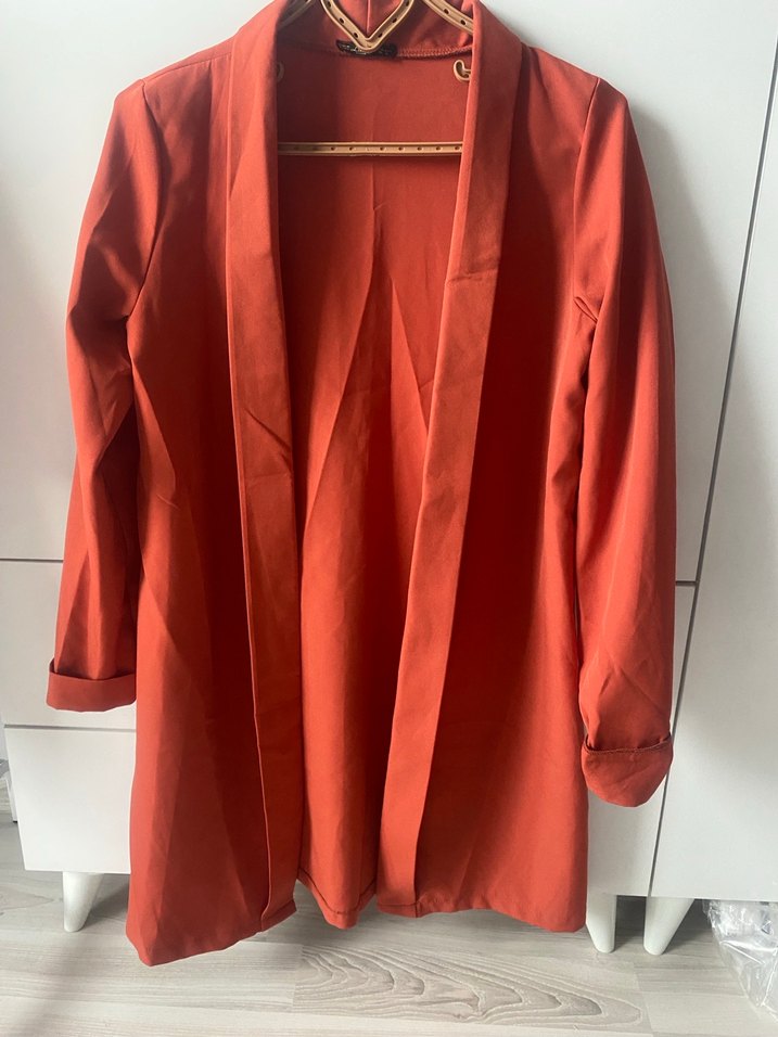 Kadın kırmızı midi ceket, parlak saten kumaştan, yakalı ve uzun kollu. Rahat kesimli, drapeli tasarımıyla ofis ve günlük kullanıma uygun.
