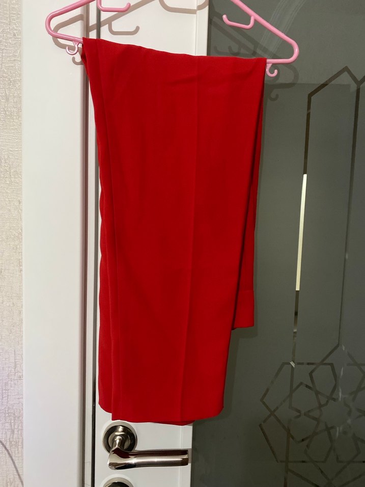 Kadınlar için normal kesim ve midi boyda, parlak kırmızı saten kumaştan, drapeli, minimalist ofis tarzına uygun pantolon.