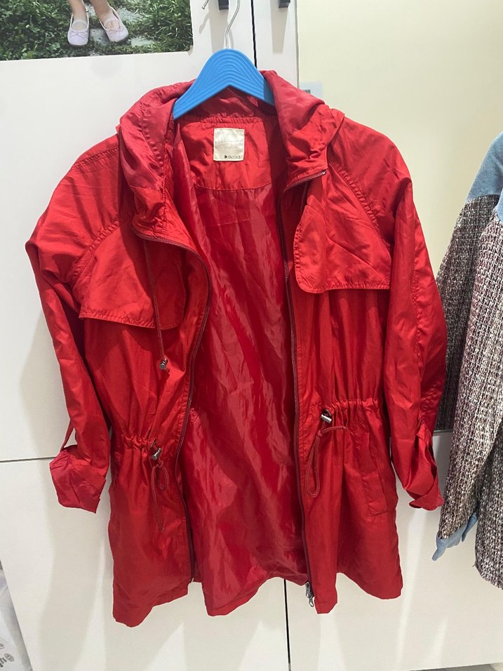 Kadın kırmızı midi yağmurluk, parlak sentetik kumaş, kesik yakalı ve uzun kollu. Fermuarlı, bol kesim, rahat dış mekan kullanımı için uygundur. ☔