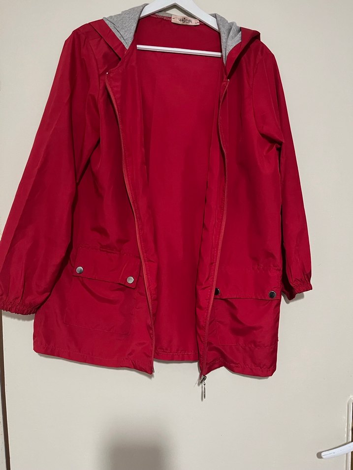 Kadın kırmızı midi yağmurluk, parlak sentetik kumaş, bol kesim, uzun kollu. Notlu yaka, fermuarlı ön ve çıtçıtlı ceplerle dış mekan için uygundur. ️