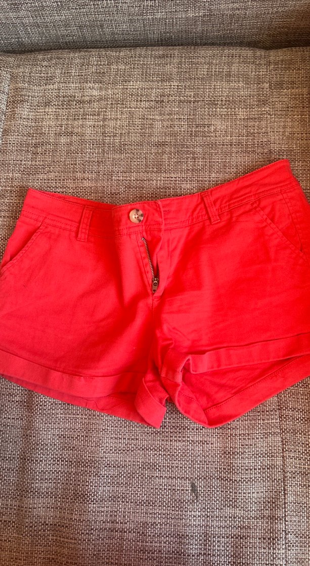 Pamuk kumaştan yapılmış, düğmeli kırmızı mini şort. Günlük kullanım için uygun, rahat ve fit kesim sokak stili şort.