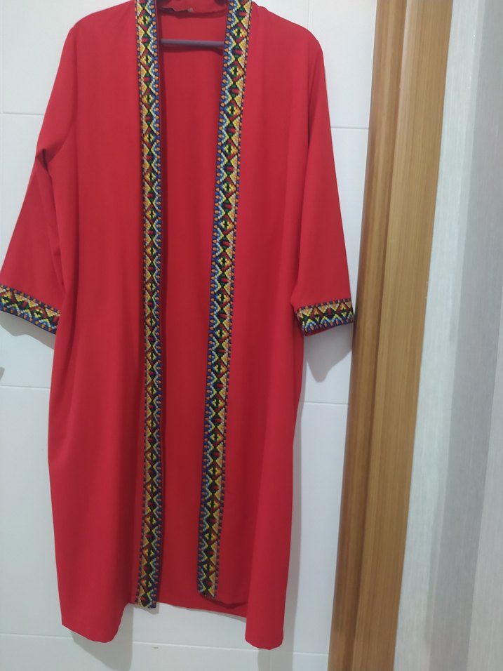 Kadınlar için uzun boy, regular fit kırmızı kap, uzun kollu ve ön ile manşetlerde renkli nakışlı desenlere sahip bohem tarzda.42.44.46.beden uymlu