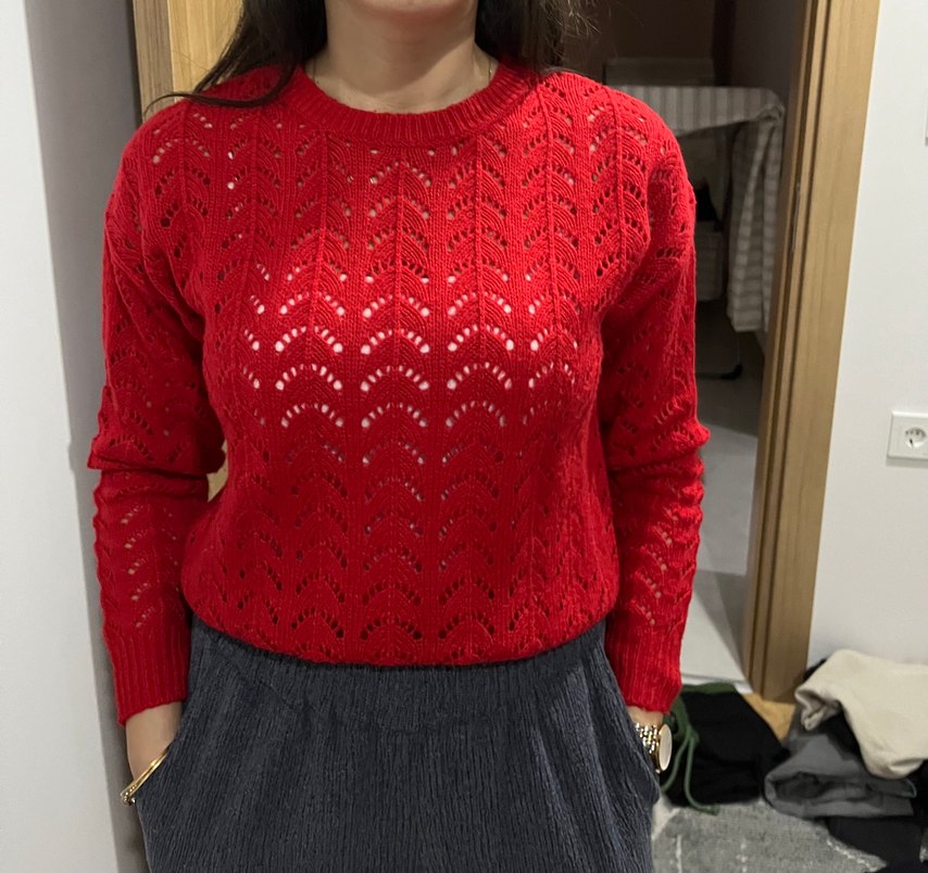 Kadın kırmızı örgü kazak, nakışlı desenli, yuvarlak yaka ve uzun kolludur. Gevşek kesimi ve midi boyu ile günlük kullanıma uygundur.
