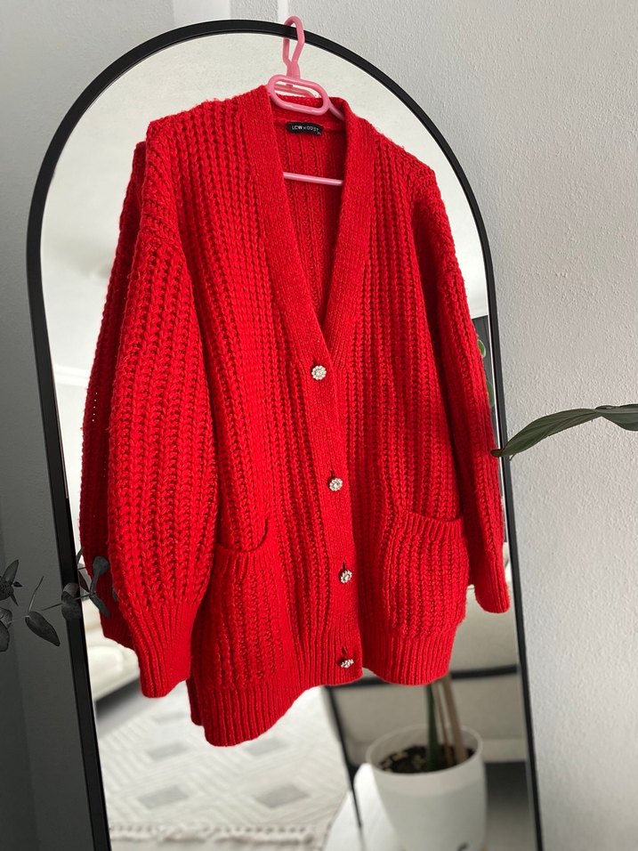 Kırmızı örgü, uzun kollu, salaş kesim hırka. Notlu yaka, düğmeli ve iki cepli, midi boyda rahat ve şık bir seçenek.