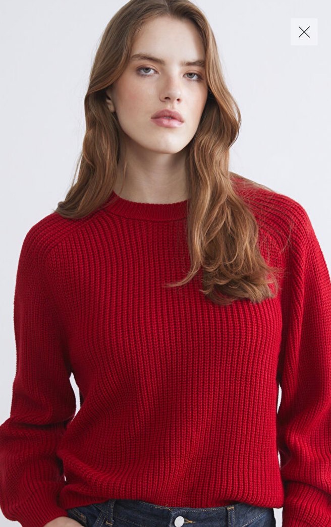 Kadınlar için parlak kırmızı örgü kumaş, yuvarlak yaka ve uzun kollu kazak. Salaş kesimi ve normal uzunluktadır, günlük rahat kullanım için uygundur.