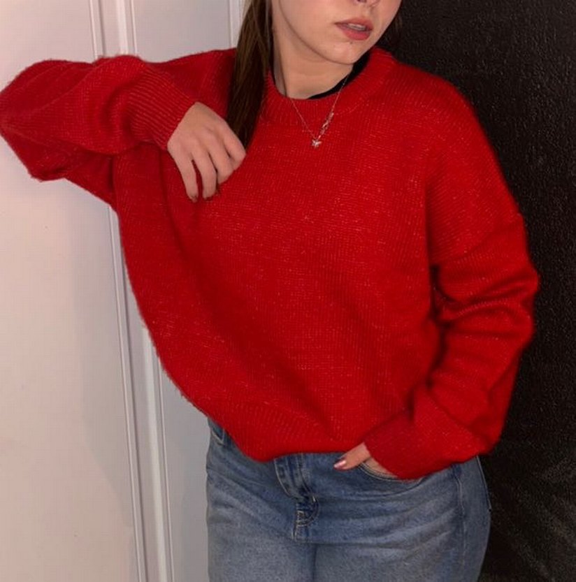 Bu kadın kazak, parlak kırmızı örgü kumaştan, yuvarlak yakalı ve uzun kolludur. Salaş kesimi ve normal boyu ile günlük rahat sokak stiline uygundur.