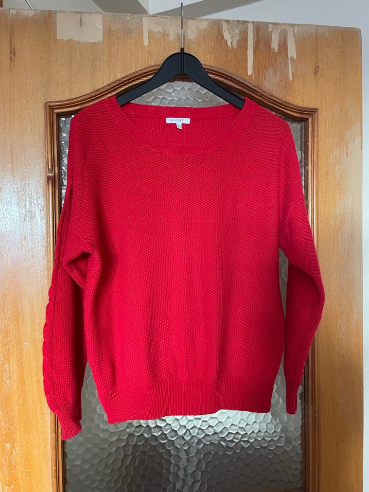 Kadınlar için örme dokulu, uzun kollu ve yuvarlak yakalı kırmızı kazak. Salaş kesimi ve normal boyu ile yumuşak örgü kumaştan, günlük kullanıma uygun modern klasik tarzda.