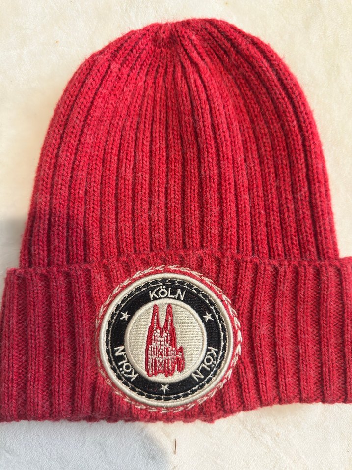 Kırmızı örgü yünden yapılmış, ribanalı dokusu ve üzerinde 'Köln' işlemeli yuvarlak bir patch bulunan rahat ve renkli kadın bere.